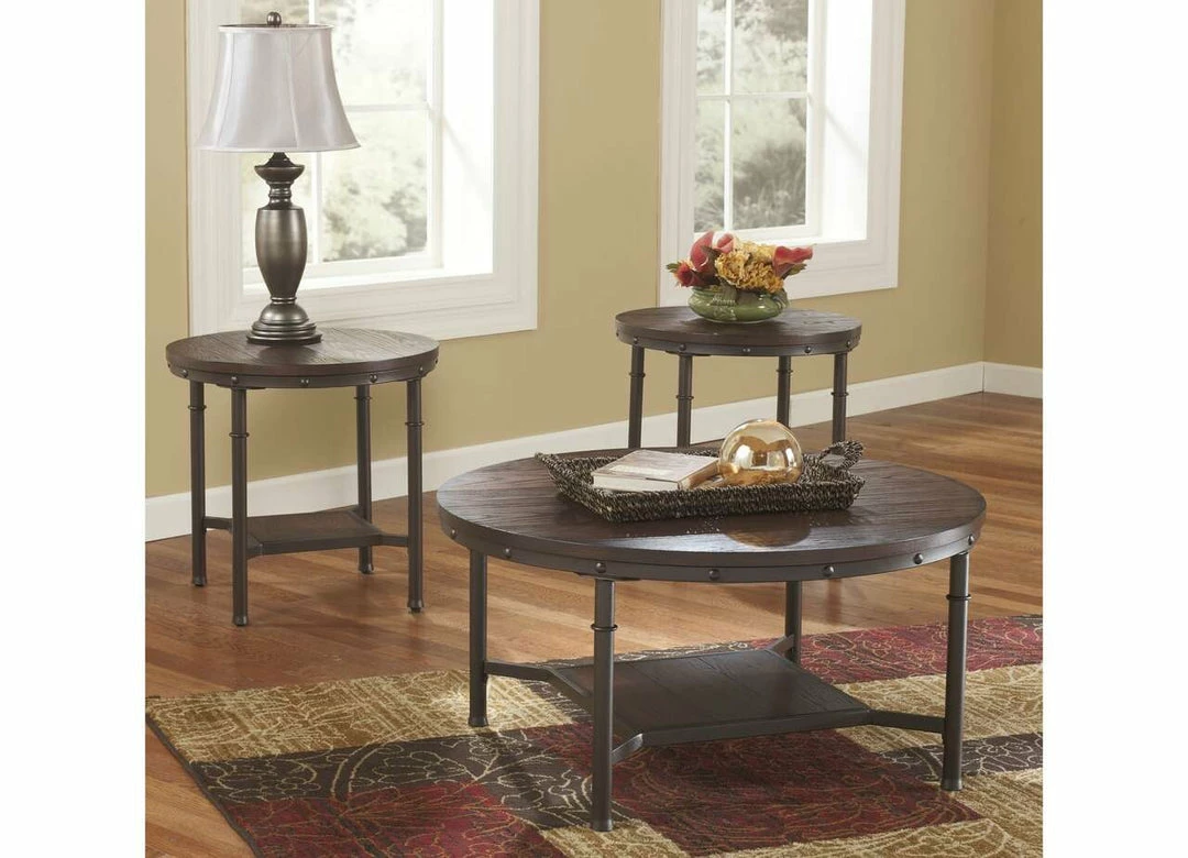 This Coffee table set is sure to set the scene for rustic refinement. Welded tubular metal with nailhead accents rounds out the look with an industrial edge. Replicated planking on the tabletops and shelving adds to the charm and character. Glaze accented powder coat finish. Top made with select veneer with wire brushed grain in a dark brown finish.