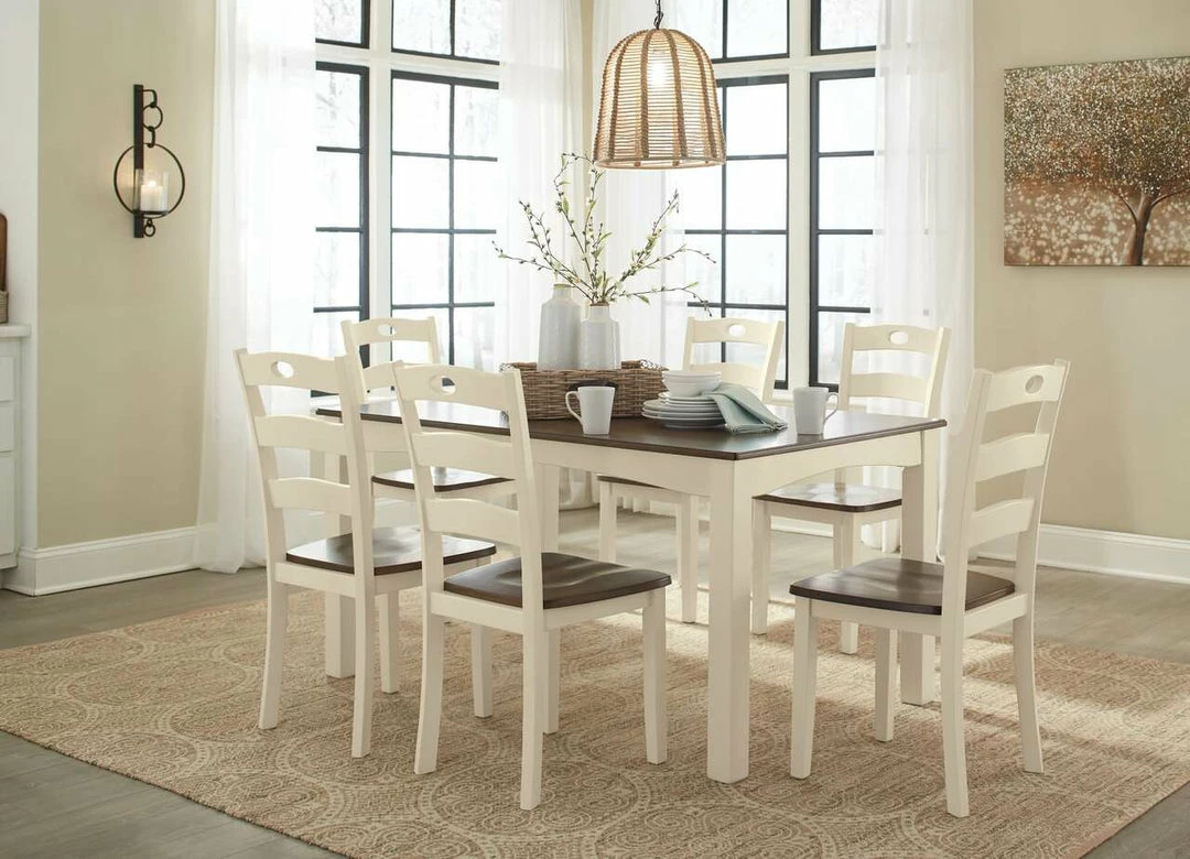 Turn your eat-in kitchen or dining room into a cottage-chic retreat with this dining room table set. Distinctive elements include a two-tone finish for a double helping of charm and shapely arched aprons. Six pierced ladderback dining chairs are a classic complement.