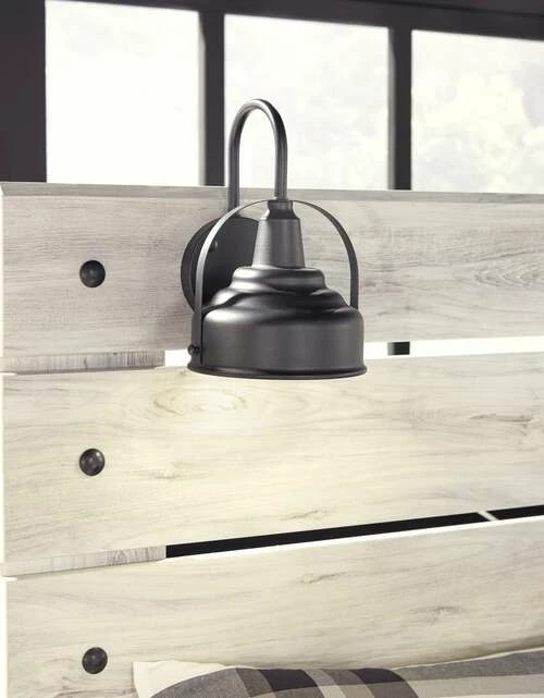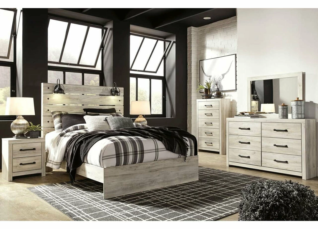 What a delightful take on rustic industrial style. Whether modern loft or modern farmhouse, this bedroom suite makes itself at home. The wispy whitewash palette enhances without covering the grain for that weathered look you crave. Headboard features decorative matte black sconce lights. Elongated drawer pulls elevate the aesthetic and side roller glides provide smooth operation. Drawers lined with a faux linen laminate for a clean, finished look. Slim profile dual USB chargers located on the back of the night stand top and the side of the headboards.