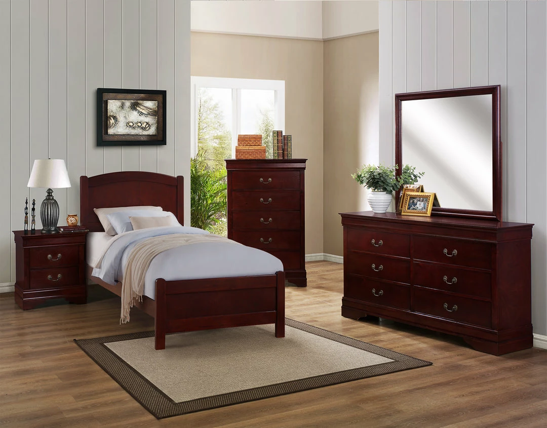 - Set includes Twin Panel Bed, Dresser, Mirror, Chest, Nightstand