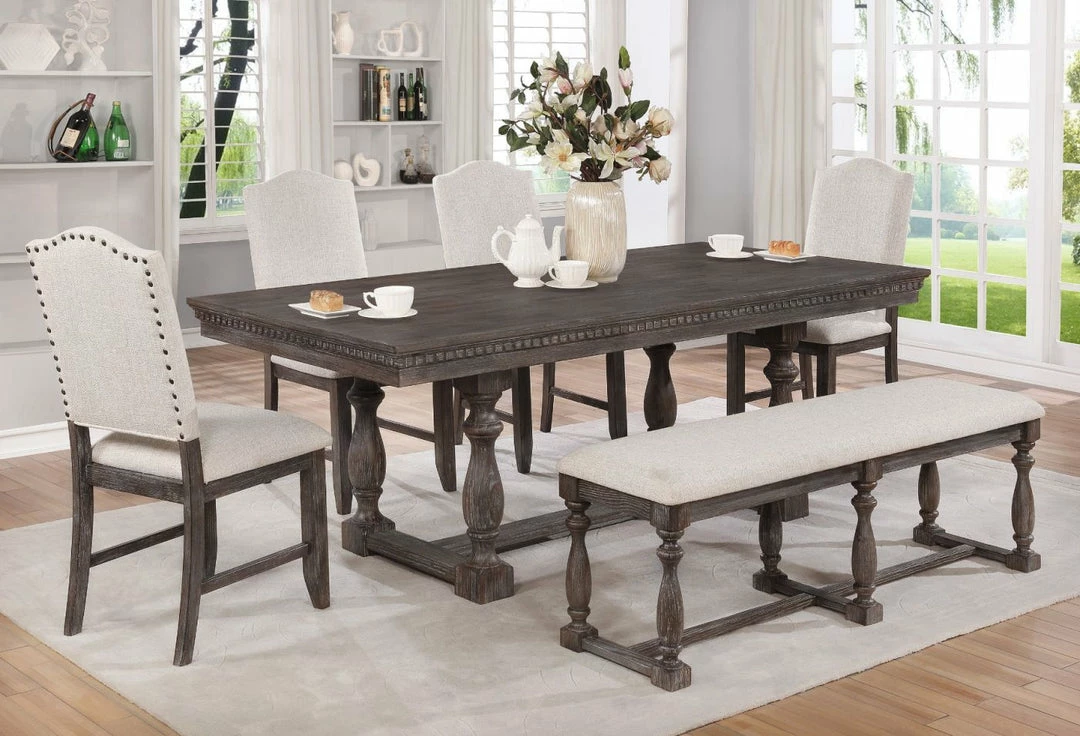 - Set includes Dining Table with 4 Upholstered Chairs and Bench