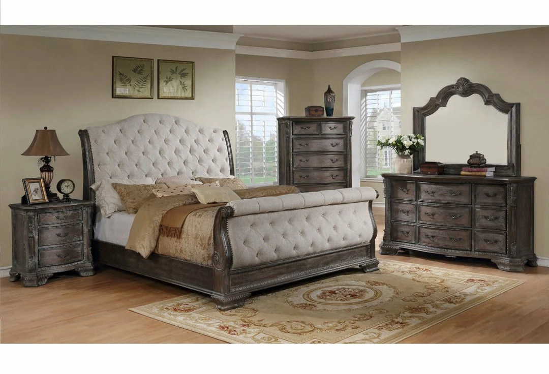 - Set includes Queen Bed, Dresser, Mirror, Chest and Nightstand